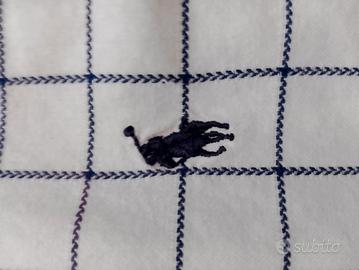 Camicia Ralph Lauren, taglia L, bianca a quadretti blu. Modello a maniche lunghe con colletto button-down, logo ricamato blu e bottoni chiari. Segnalo un leggero ingiallimento nella zona del colletto.