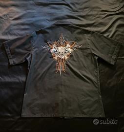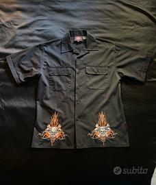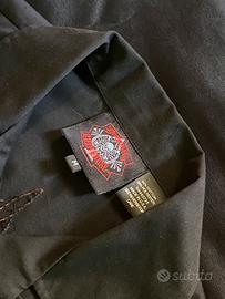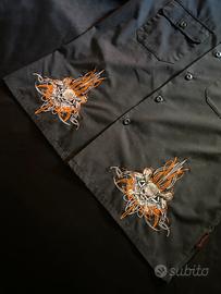 Vendesi camicia da uomo originale Dragonfly Roadhouse, taglia M. Il capo è caratterizzato da un'estetica decisa, tipica del mondo delle moto e della cultura custom, con il classico logo ricamato che include un teschio e dettagli grafici elaborati.