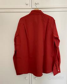 Elegante camicia da uomo di colore rosso, caratterizzata da maniche lunghe e bottoni bianchi.