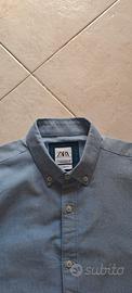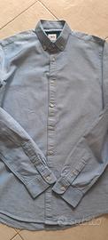 camicia tessuto di cotone tipo jeans , manica lunga con due bottoni uno ai polsi e l'altro alla manica, collo con bottoncini, taglia S colore celeste