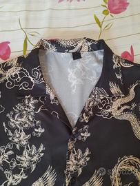 Vendo camicia nera decorata con stampa dorata raffigurante classici elementi della cultura giapponese, draghi, fiori e aironi.