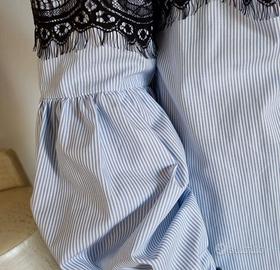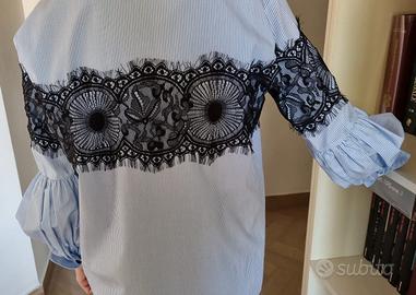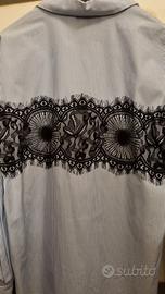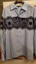 Vendo camicia Denny Rose, tg S, fondo celeste a righine impreziosita da pizzo e maniche a sbuffo, nuovissima, mai indossata