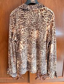Camicia da donna a maniche lunghe sartoriale. Caratterizzata da una vivace fantasia leopardata sui toni del marrone e beige, presenta un classico colletto e chiusura frontale con bottoni chiari. Il tessuto leggero e fluido offre una vestibilità confortevole e versatile.