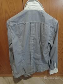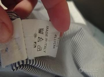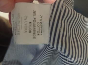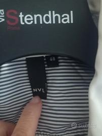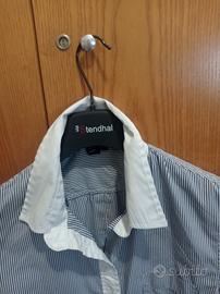 Camicia donna a righe blu e bianche con collo e polsini a contrasto di colore bianco. Marca NVL, made in Italy. In misto cotone.Taglia 48. Larghezza spalle 39 cm. Giro petto 49 cm. Lunghezza 69 cm. Lunghezza manica dalla spalla al polsino 60 cm.