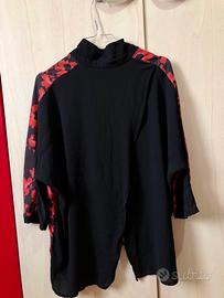 La camicia di colore nero si presenta con una fantasia floreale di colore rosso, colletto, chiusura a bottoni, manica 3/4 ed uno spacco sul retro 👚