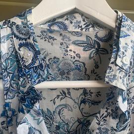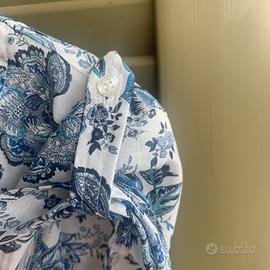 Camicia donna leggera elegante con particolare in vita nuova taglia L veste bene manica con bottoncino camicia con motivo floreale bianco e blu