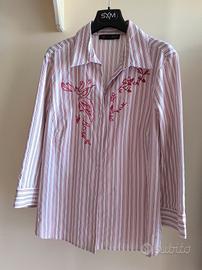 Camicia donna tg 46 italiana bianca a righe rosse. In ottime condizioni, marca Sym gruppo Veste bene.Tessuto leggermente elasticizzato Manica a tre quarti. Misure: spalle 42, ascelle 53, lunghezza 67., lunghezza manica 48. Tessuto cotone 66 poliestere 31 elastane 3