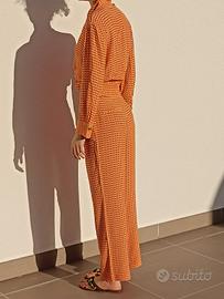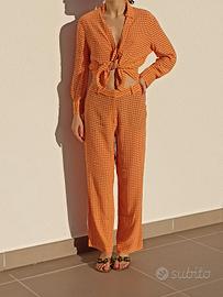 Vendo questo set coordinato in una splendida tonalità arancio vibrante con micro-fantasia geometrica. È un completo leggero, chic e incredibilmente versatile.