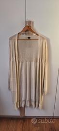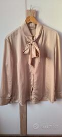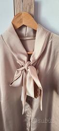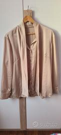 Vendo stupendo completo composto da una camicia in raso color sabbia dorato con fiocco che si può tenere sia legato che slegato e suo cardigan sempre color sabbia con tocchi di filo dorato nella trama. Vendo causa totale inutilizzo e comprato solo per un battesimo. Perfetto per autunno e primavera. Taglia XXL ma va bene anche come XL. NO stiro. Preferibile consegna a mano. Spese di spedizione a carico dell'acquirente. NO scambio.