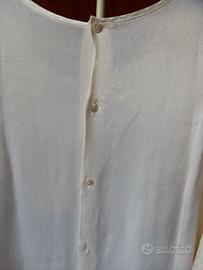 Elegante blusa di sapore vintage, in tinta crema con fiocco chiuso da decorazione con strass . Dettagli sartoriali, come la chiusura dei polsi e l' abbottonatura sulla schiena .