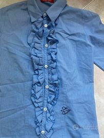 Camicia originale Liu-Jo a righe sottili bianche e blu, perfetta per un look elegante ma moderno. Il dettaglio con volant sul davanti e la firma ricamata LJ la rendono unica e femminile. Taglio leggermente aderente, valorizza la figura.