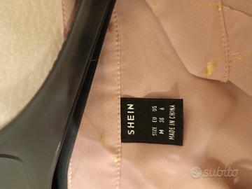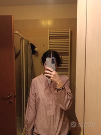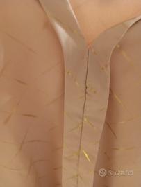 Vendo questa camicia, con scollo a V, senza bottoni. Il colore è rosa e le fantasie a strisce che vedete sono color oro. È praticamente nuova, indossata solo una volta. È leggera ed elegante.