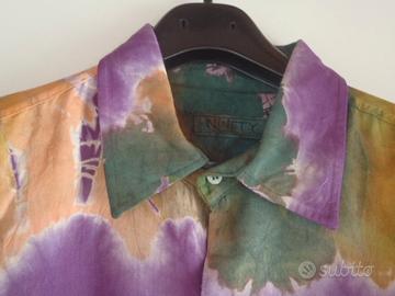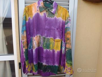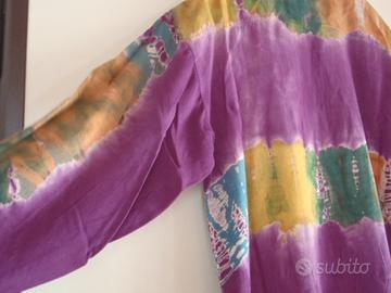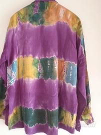 Vendo camicia in tessuto colorato a fantasia con tonalità di viola , verde, giallo maniche lunghe con colletto, ai lati due passanti per poterla stringere in vita, taglia M (ottima vestibilità) allacciatura da uomo, ma potenzialmente anche unisex provenienza Londra, marca "NINETY Distinguished Clothing"