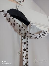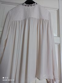 camicia color bianco avorio con inserti in metallo nella fascetta da poter legare al collo e leggera arricciatura nella parte posteriore.