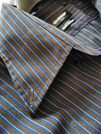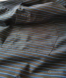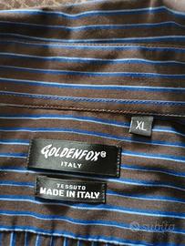 Vendo camicia di marca Goldenfox colore marrone con pinstripes blu e azzurre, con chiusura a bottoni con asola blu e una tasca frontale altezza petto sulla sinistra. La camicia è in ottime condizioni con pochissimi segni del tempo, tessuto 100% cotone.