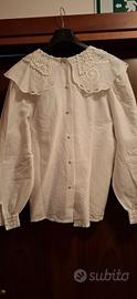 Camicia in lino puro, Cortina ,con maniche a sbuffo e grande collo doppio in due pizzi diversi. passamaneria nelle maniche. tg M 44/46 . è una camicia comperata a Cortina è per mettere con vestito tirolese . Pagata 90 usata solo una volta.