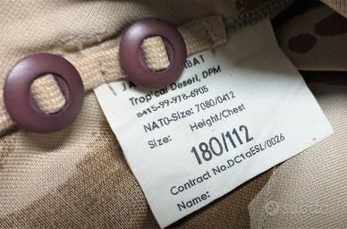 Stupenda camicia inglese DPM desert RARO modello tropical, originale, perfetto stato (credo mai usata) con etichetta militare. La taglia NATO 180-112 significa che è idonea per una persona alta circa 1.70 m. con petto di112 cm. potrebbe essere attorno ad una L-XL senza nessun impegno in merito alle taglie, la cedo esclusivamente come oggetto da collezione. Modello con chiusura a zip ed abbottonatura. Stupendo pezzo originale militare, non commerciale.