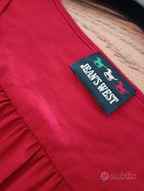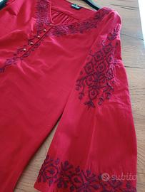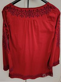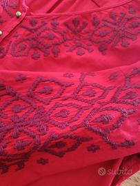 Camicia donna, marchio Jean's West, cotone 100%, colore rosso scuro, manica lunga ampia, interamente ricamata con disegno geometrico. I ricami sono presenti anche sullo scollo e nel bordo inferiore della camicia. Chiusura con 5 bottoncini in ottone. La camicia ha un taglio svasato. Ottime rifiniture.