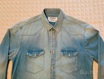 Camicia a manica lunga da uomo in jeans impreziosita da bottoni a pressione effetto madreperla sul davanti e sulle maniche.