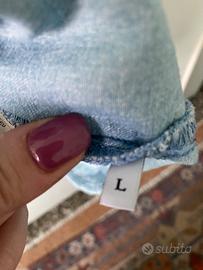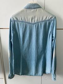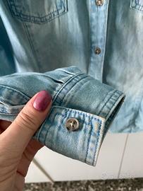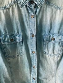 Camicia di jeans in denim leggero, colore azzurro chiaro effetto scolorito, modello da donna affiancato, vestibilita’ sagomata. Marca Tezenis. Due taschini anteriori chiusi con patta e bottoncini. Taglia L. Indossata un paio di volte, come nuova.