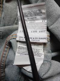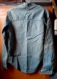 Bellissima camicia jeans Levi Strauss & Co., ovviamente di puro cotone, con collo alla coreana chiuso con laccio di cuoio intrecciato, maniche lunghe con bottoni automatici ai polsi, due tasche oblique. Taglia come da foto, penso che potrebbe vestire anche una donna minuta, ma confrontate le misure: ascelle 45 e lunghezza 66 cm. Usata, ma in ottimo stato (la red tab si è staccata da un lato ma ovviamente non è importante, e comunque per rifissarla basta dare due punti). Preferirei a mano.