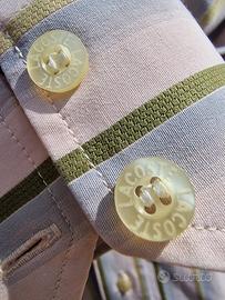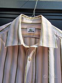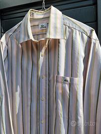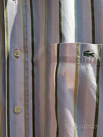 Un vero pezzo di qualità, di quelli che non si trovano più in giro con questa cura dei dettagli! È una camicia vintage Lacoste della linea classica, tenuta benissimo e originale al 100%. Si riconosce subito dai dettagli che fanno la differenza. Ha un motivo a righe verticali in tonalità pastello davvero delicate: verde salvia, azzurro polvere e rosa. Un mix che non passa mai di moda. La realizzazione è in popeline di cotone di alta qualità, quindi è fresca, resistente e si stira una meraviglia. È di quelle camicie che ti danno subito un'aria curata senza sforzo. Se cerchi un capo con carattere, fatto bene e con una storia, questa fa per te! I dettagli che la rendono speciale: · Il classico colletto Lacoste, perfetto · I bottoni chiari con il logo inciso · Le cuciture precise e rifinite a regola d'arte · Il taschino sul petto con il coccodrillo ricamato È una 42, ma per me ormai è troppo grande. Spero che possa essere indossata da qualcuno che la valorizzi e ci si senta a suo agio.