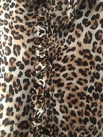 Vendo bellissima camicia con stampa animalier (leopardata), caratterizzata da un elegante dettaglio a ruches/volant lungo l'abbottonatura centrale. Il capo è molto versatile: perfetto per un look grintoso con un paio di jeans, oppure più formale se abbinata a un pantalone nero o una gonna a tubino.