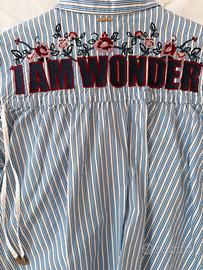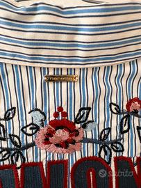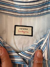 Camicia Nenette, taglia S, ottimo stato. Fantasia a righe bianche e azzurre, scritta sulla schiena ricamata.