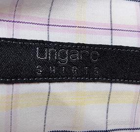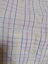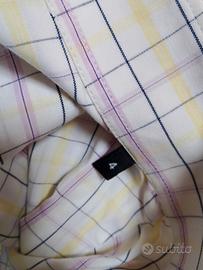 Delicata fantasia di sottili righe nere che formano quadretti su sfondo bianco con spesse righe giallo pallido e lilla.