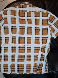 camicia a maniche corte Burberry con motivo a quadri, parte della collezione uomo. Questo modello presenta l'iconico motivo Vintage Check del marchio, caratterizzato da toni neutri, marroni e bianchi, con linee rosse e nere che si intersecano.