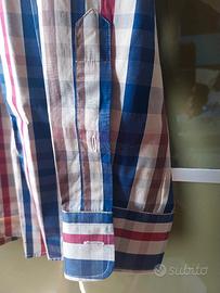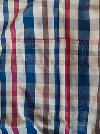 Indossato poche volte, collo botton down,taschino con logo sul cuore .colore di base beige con righe verticali larghe blu marroni rosse e righe verticali che formano quadri beige più scuro