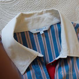 Camicia Marella sport a righe azzurro, bianco e rosso.Collo e polsi chiusi da bottoncini firmati Marella. Cotone elasticizzato con pinces, può essere indossata anche aperta grazie ai dettagli, come l' allacciatura rifinita da gros grain rosso. Tg 42