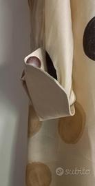 Articolo color senape chiaro a stampa grandi pois melange neri e senape in chiffon di pura seta, colletto a punta triangolare e maxi polsi in lino écru:presenti tre bottoni piatti in legno marrone chiaro a fermare sia colletto che polsi.