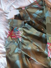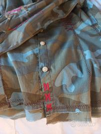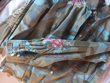 vendo camicia camouflage con ricami fioriti e scritte. Sfondo color verde militare. in buono stato, veste una tg 40/42