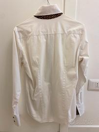 Bellissima camicia bianca con risvolti marroni a pois bianchi sul colletto e sotto i bottoni (qui vengono nascosti se chiusi i bottoni). Marca Naracamicie, taglia XS. Puó essere utilizzata in occasioni eleganti sopra un pantalone marrone e piu sportivamente su jeans o pantalone simile. Disponibile spedizione.