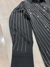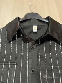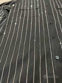 Camicia nera dal design elegante, caratterizzata da sottili righe verticali con effetto luminoso/glitterato che donano un tocco raffinato e originale.Perfetta per occasioni eleganti, serate o outfit chic con un tocco particolare ✨ taglia M/L