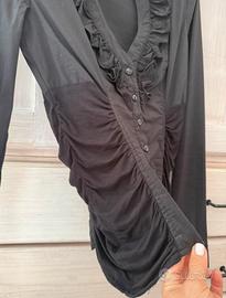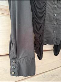 Camicia nera super femminile e particolare – taglia S ✨ Bellissima camicia nera in cotone modello Wellly, dal design originale e ricercato. La parte frontale e posteriore è realizzata in cotone più strutturato, mentre i fianchi sono in cotone elasticizzato che valorizza la silhouette e garantisce comfort. Dettagli che fanno la differenza: • Delicati frufru lungo il colletto e che scendono fino alla vita • Scollatura molto sensuale e raffinata • Maniche con taglio a “fetta di salame”, super particolari • Bottoni appuntiti e unici, davvero originali Vestibilità aderente, perfetta per un look elegante ma con carattere Perfetta sia con jeans che con gonne per outfit chic e femminili!