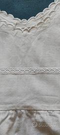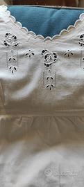 vendo camicia sottoveste anni 30 in tela bianca ,corredo non utilizzato , fatta completamente a mano ,come era d'uso. negli anni 90 è stata trasformata in abito, copricostume .la ricca smerlatura delle spalle aperte e del giro manica fa risaltare 5 motivi floreali a intarsio sul petto.presenti cifre ricamate B I il corpino è stile impero ,ben delineato da pinces,nella gonna sono state inserite 2 tasche. il fondo è rifinito con piccolo pizzo . misura cm 100 lung,petto cm 45 . usata con riguardo . prezzo € 25 possiedo altre camicie vecchie originali con ricami vari .