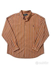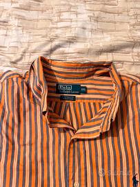 Splendida camicia originale Polo Ralph Lauren in cotone di alta qualità. Caratterizzata da una fantasia a righe orizzontali e verticali nei toni dell'arancione, blu navy e bianco.