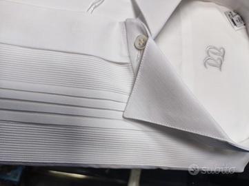 Camicia da cerimonia bianca, elegante con piccole pieghe e con polsini per gemelli. Credo colletto sia per papillon. Alta qualità italiana, cotone finissimo, marca TT, nuova in scatola originale misura 40 corrisponde ad una M-L collo quasi 16 (quella fella foto è la gemella 41 non piu disponibile).