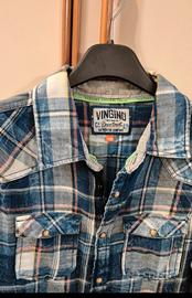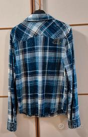 camicia a quadri blu e bianca, bottoni a scatto, taglia M