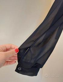Elegante e versatile camicetta in chiffon con colletto. Le maniche possono essere accorciate sopra al gomito grazie ad una seconda chiusura con bottone. Mai indossata, in perfette condizioni. Taglia M, veste morbida