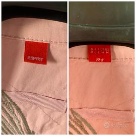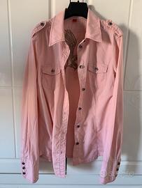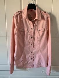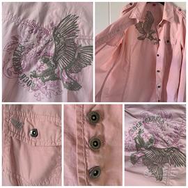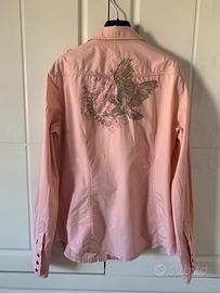 Camicia maniche lunghe per donna color rosa salmone con piccole borchie e fantasia sulla schiena con ricamo di un’aquila e scritta “Rock Rebels”, brand Esprit.