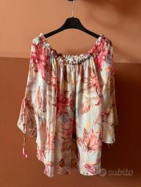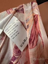 Camicia in seta firmata Artigli a motivi floreali dai tenui colori beige e rosa, da portare anche scivolata sulle spalle, maniche tre quarti con laccettini sul volant al fondo, in pregiato tessuto in seta e con fodera in viscosa tutto 100/100, fresca e leggera; perfetta, direi nuova. Taglia 44 ma scende molto bene sia nella taglia superiore che inferiore.