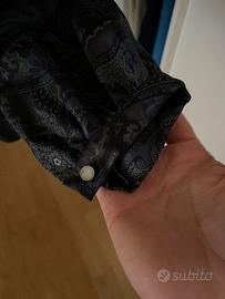 Camicia in seta sfondo blu, collo a sciarpa