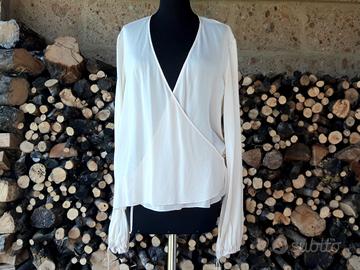 Camicia in pura seta bianco avorio dalle maniche lunghe con sbuffo finale che si possono stringere con un nastrino.