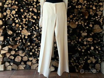 Pantalone flare in viscosa con piega stirata avorio con vita leggermente bassa, tasche laterali diagonali, chiusura frontale con gancio e zip, cintone interno che evoca la sartoria maschile.