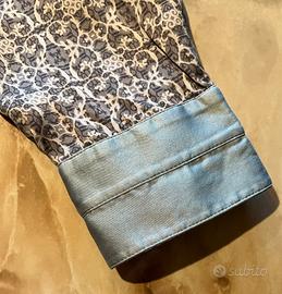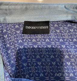Camicia originale Emporio Armani 100% seta, con fantasia geometrica multicolor nei toni del grigio, azzurro e viola. Chiusura frontale laterale con bottoni. Adatta sia a look formali che casual. In ottime condizioni come da foto.