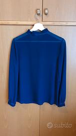 Elegantissima e morbida camicia blu con dettagli in seta. Marca Sisley. Taglia S. Laccio al collo. Come nuova!