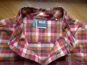 Camicia Tecnica Jack Wolfskin, misura M, colore arancio/marrone/bianco, taschino anteriore con bottone. In perfette condizioni, pari al nuovo.